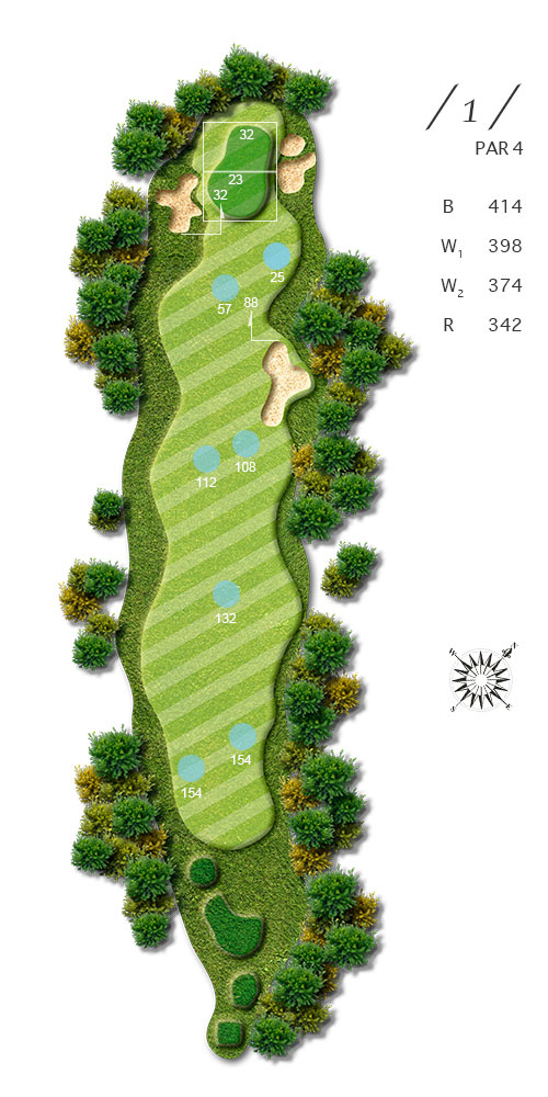A straight forward downhill hole, there is only one fairway bunker on the right, 296 yards away. With the same carry, if you hit to the left half fairway, you will reach a plateau, leaving you a 100 yards second shot. The last place you can go is the left of the green.